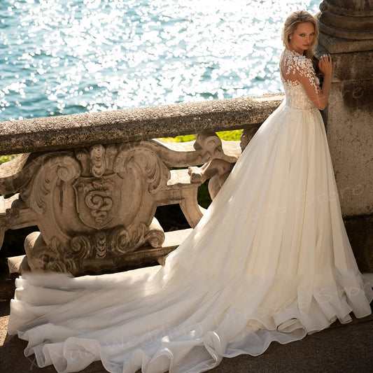 2024 Generous Graceful A Line Women's Wedding Dresses Charming Lace Appliques Bride Gowns Long Sleeve Beaded Beach فستان الزفاف