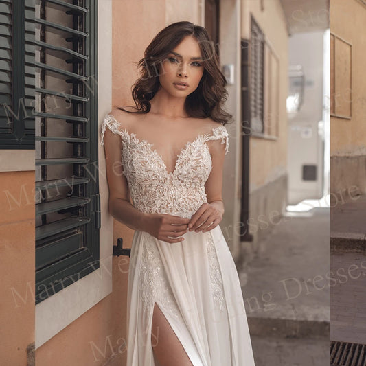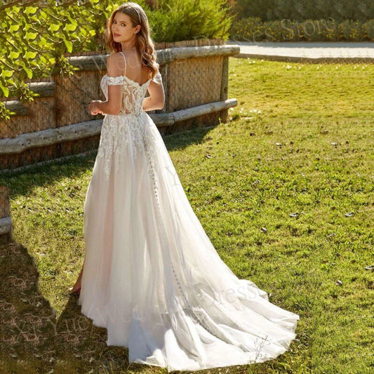 2024 Boho Graceful A Line Women's Wedding Dresses Charming Lace Appliques Bride Gowns Off The Shoulder Side Split Robe De Mariee
