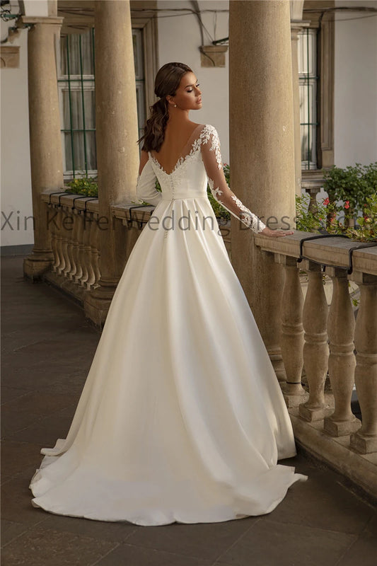 2024 Long Sleeve Satin Wedding Dresses Elegant Women's Round Neck Lace Applique Princess Bridal Dress Sheer Sexy Open Back Robe
