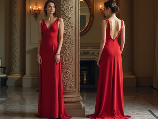 Command the room with confidence and allure in this stunning red satin evening gown, designed...