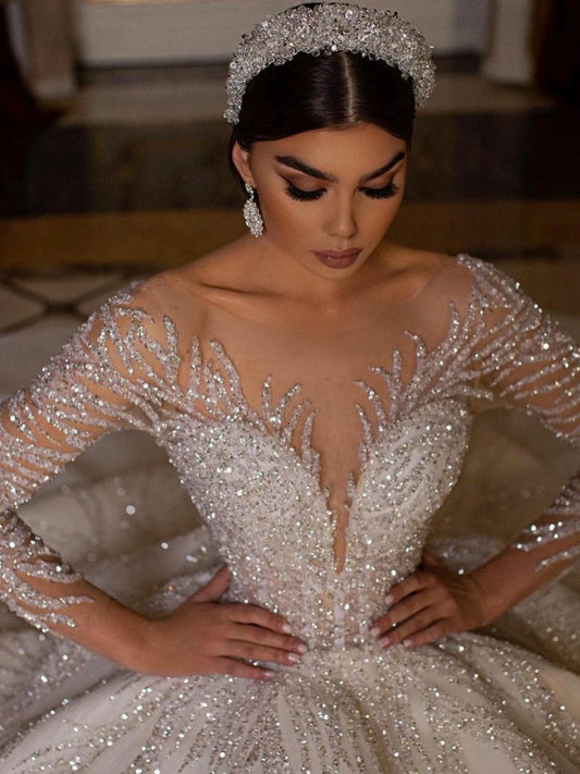 Classic O-neck Long Sleeve Wedding Dress Sparkly Sequins Bride Robe Luxury Ball Gown Long Bridal Gown Robe De Mariée