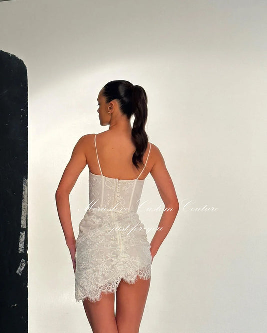 Merioslove Short Wedding Dresses Lace Appliques Sleeveless Spaghetti Straps Mini Civil Bride Dress Beach Tulle Wedding Gown