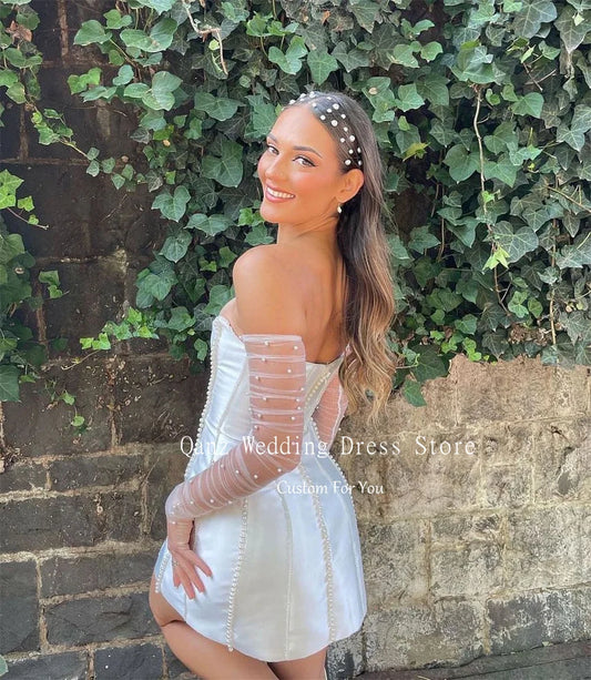 Qanz Pearls Short Wedding Dress White Satin Long Sleeves Illusion Sexy Vestidos De Fiesta Strapless Mermaid Bridal Gowns 2024