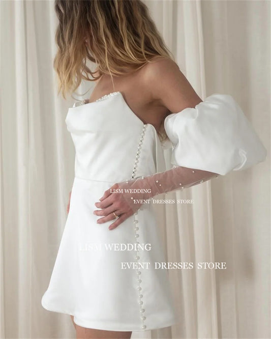 LISM Elegant Short Mini Wedding Dress Strapless Satin Beads Sparkly Formal Party Dress Custom Off Shoulder Backless Bridal Gown