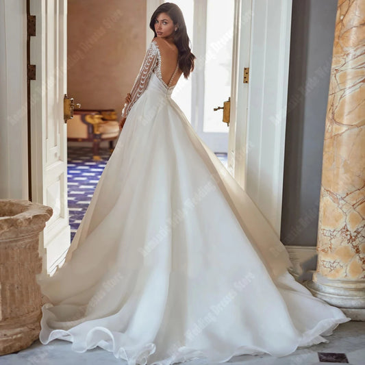 Princess Elegant Wedding Dresses For Woman Applique Long Sleeve Sexy V Neck Backless Satin 2024 Bride Gowns Vestidos Para Mujer