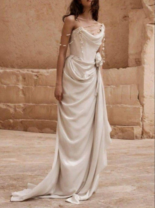 Simple Lvory Wedding Dress Satin Draped Elegant Party Dresses Woman Straight Scoop Neck Long Dresses 2024 Bride Gowns for Women