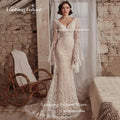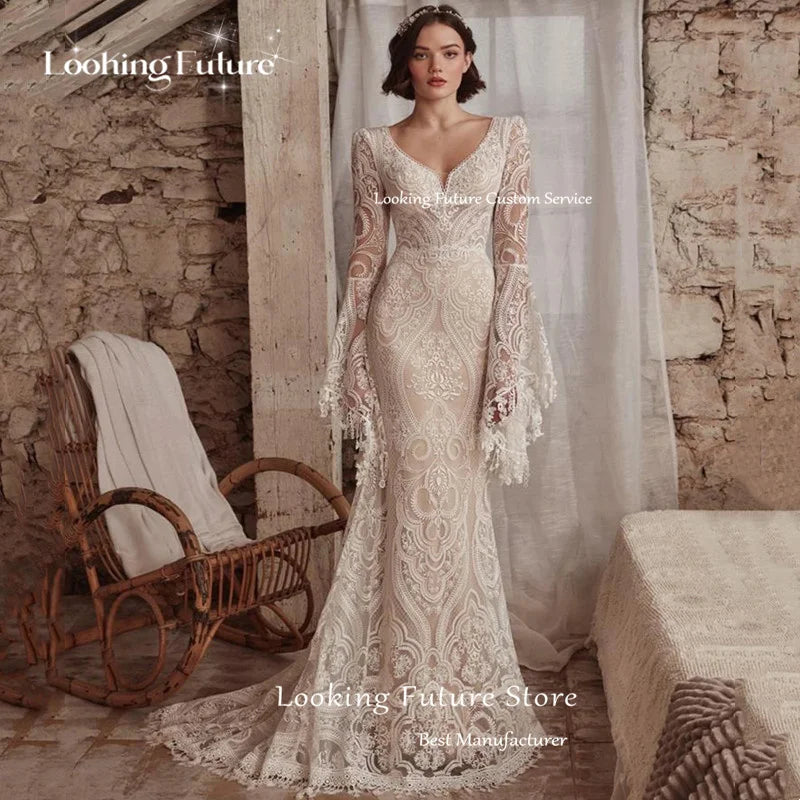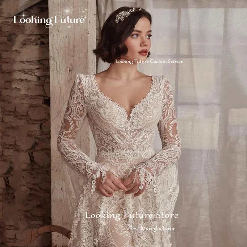 Boho Mermaid Wedding Dresses Long Sleeve Pleat Sexy Lace Illusion Bridal Gowns V-Neck Backless Zipper Sweep Train Vestidos 2024