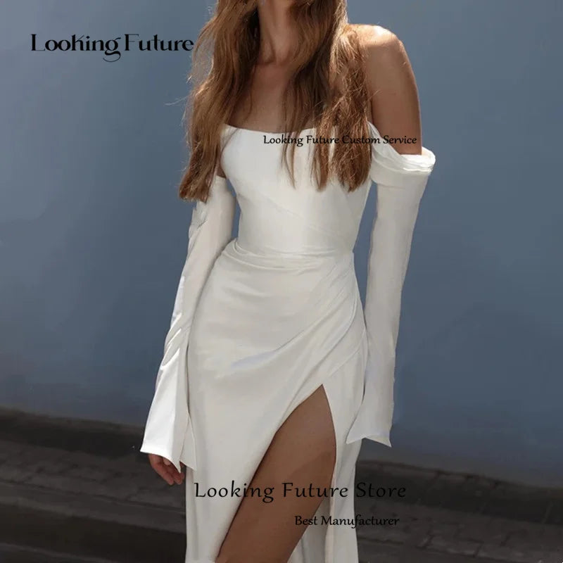 Elegant Satin Mermaid White Wedding Dress For Woman Off the Shoulder Bride Gown Strapless Illusion Long Backless High Side Slit