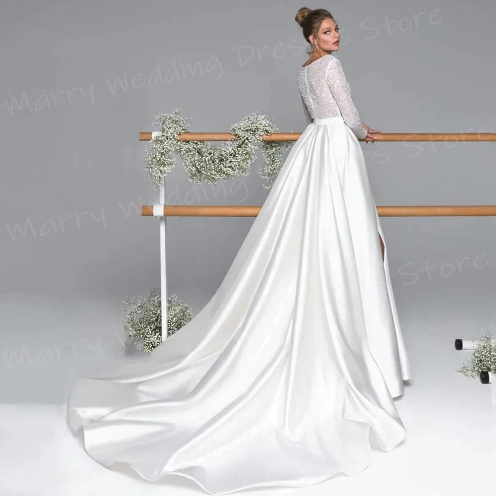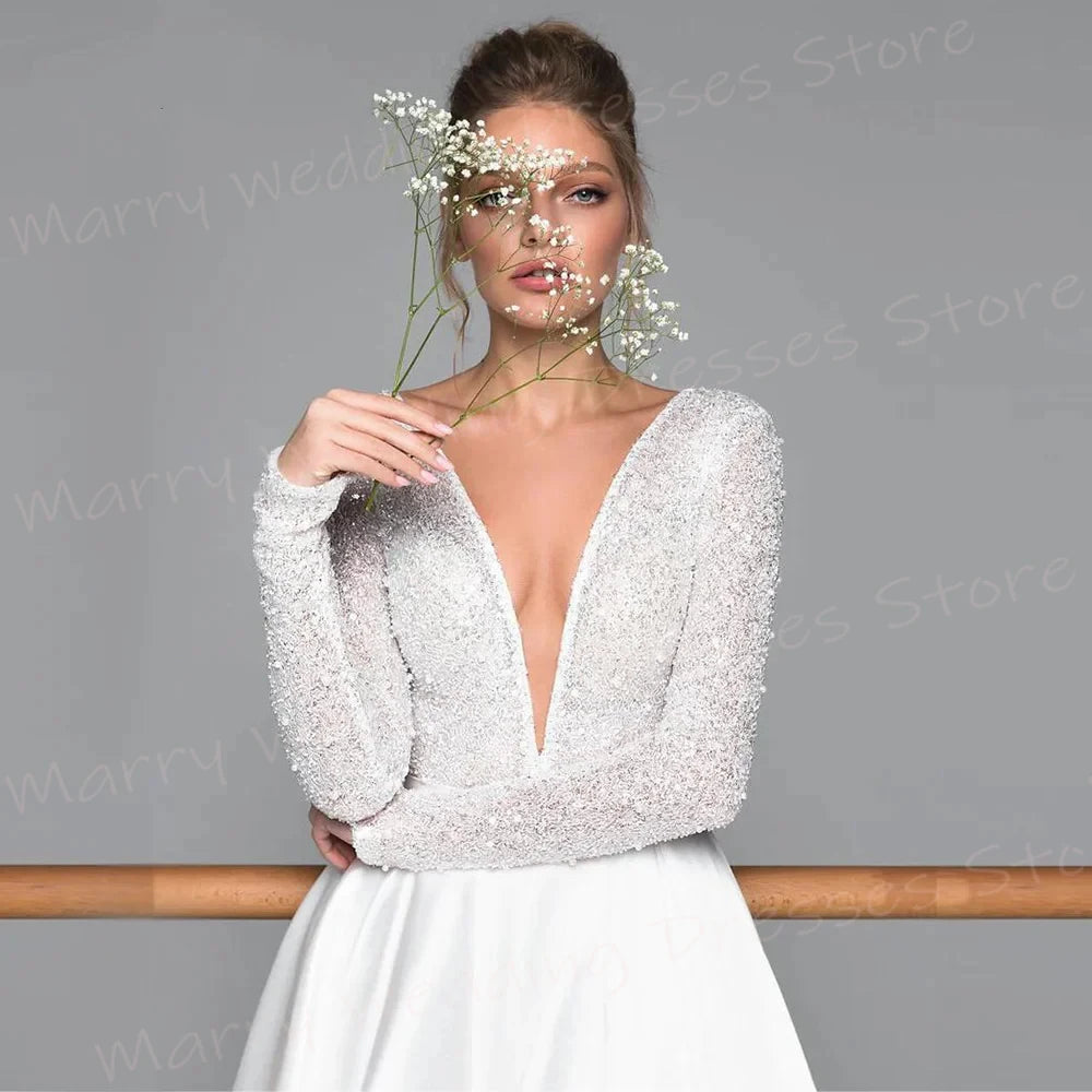 Fascinating Deep V Neck A Line Women's Wedding Dresses Simple Long Sleeve Bride Gowns Modern Sexy Side High Split Abiti Da Sposa
