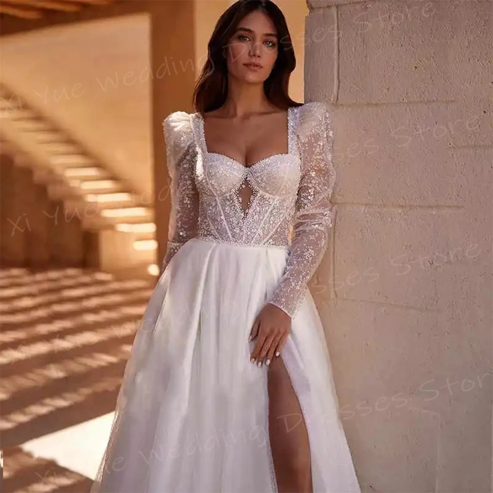 Gorgeous Modern A Line Women's Wedding Dresses Shiny Long Sleeve Lace Up Bride Gowns Charming Side High Split Vestido De Noivas