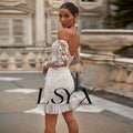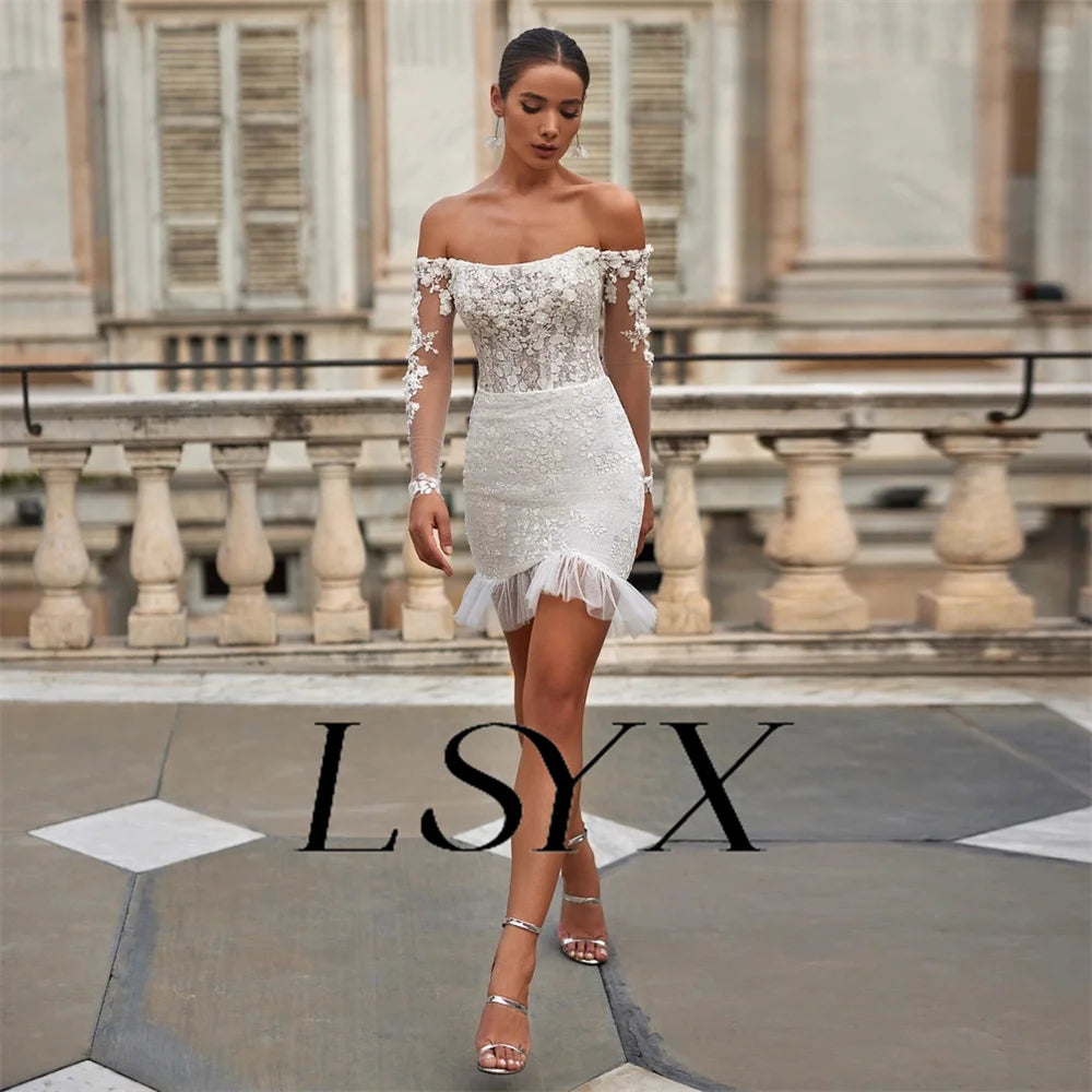 LSYX Boat Neck Long Sleeves Sheath Tulle Mini Wedding Dress For Women Open Back Above Knee Short Bridal Gown Custom Made