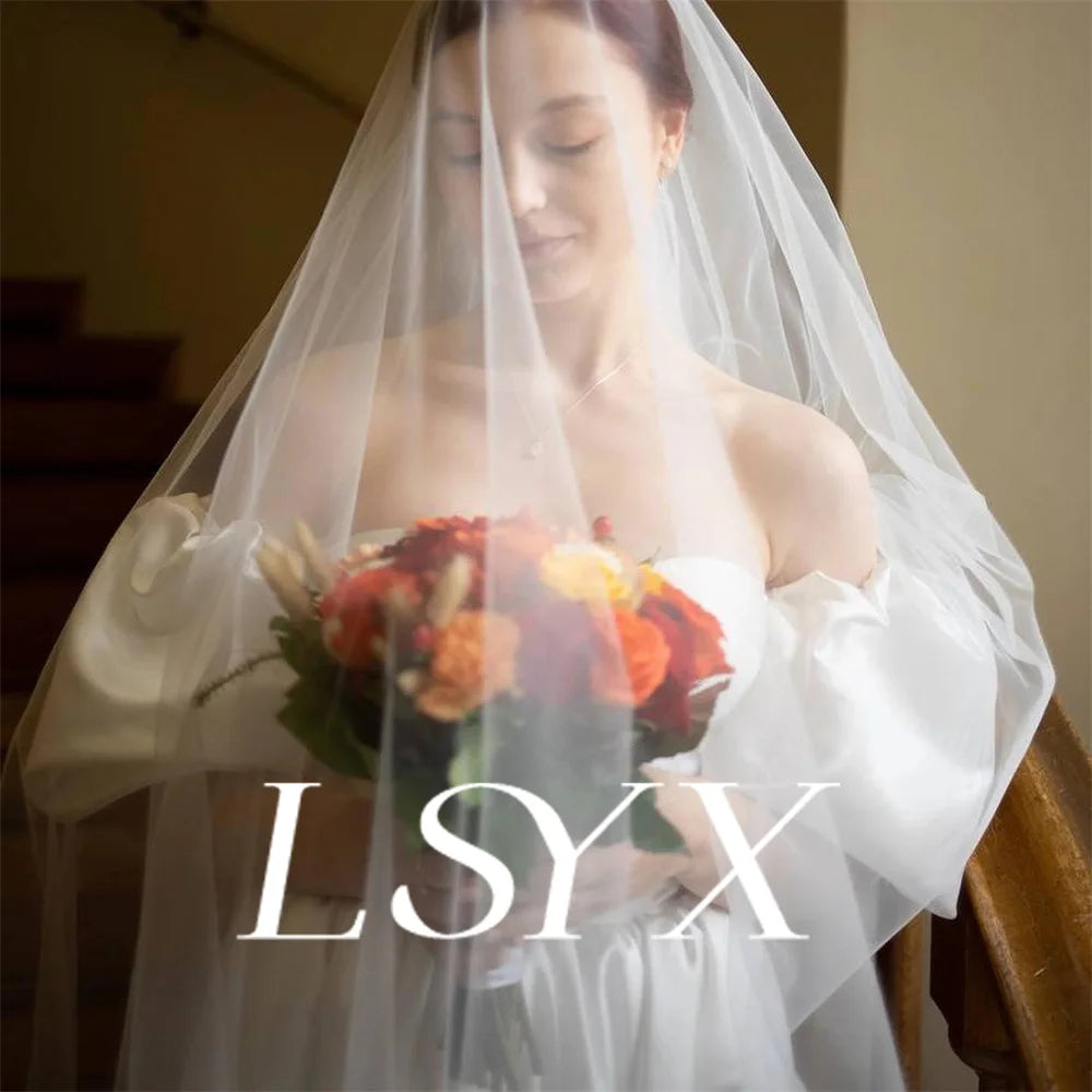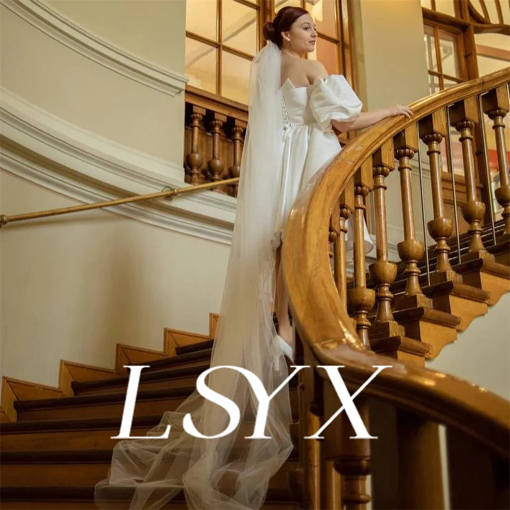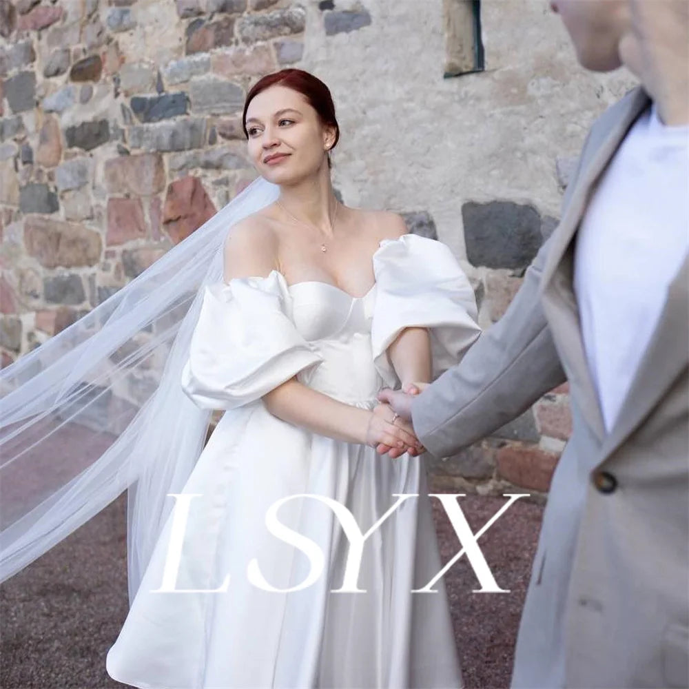 LSYX Off Shoulder Puff Sleeves Satin Mini Wedding Dress For Women A Line Open Back Above Knee Short Bridal Gown Custom Made