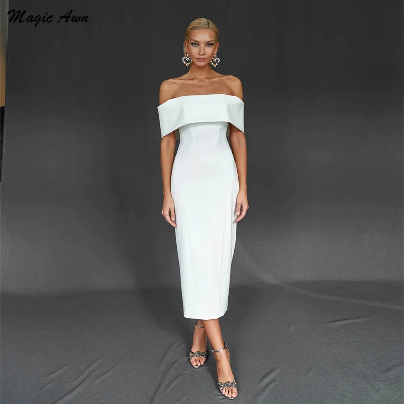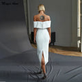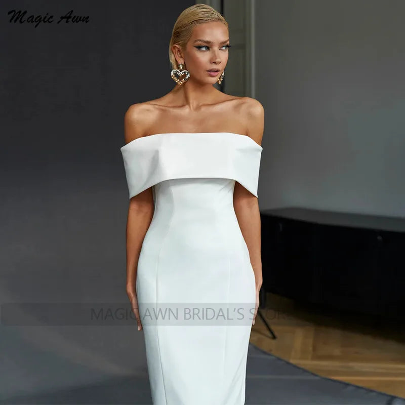 Magic Awn White Wedding Dresses Off The Shoulder Back Split Tea-Length Bidal Gowns For Women Simple Bodice Wedding Party Gowns