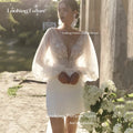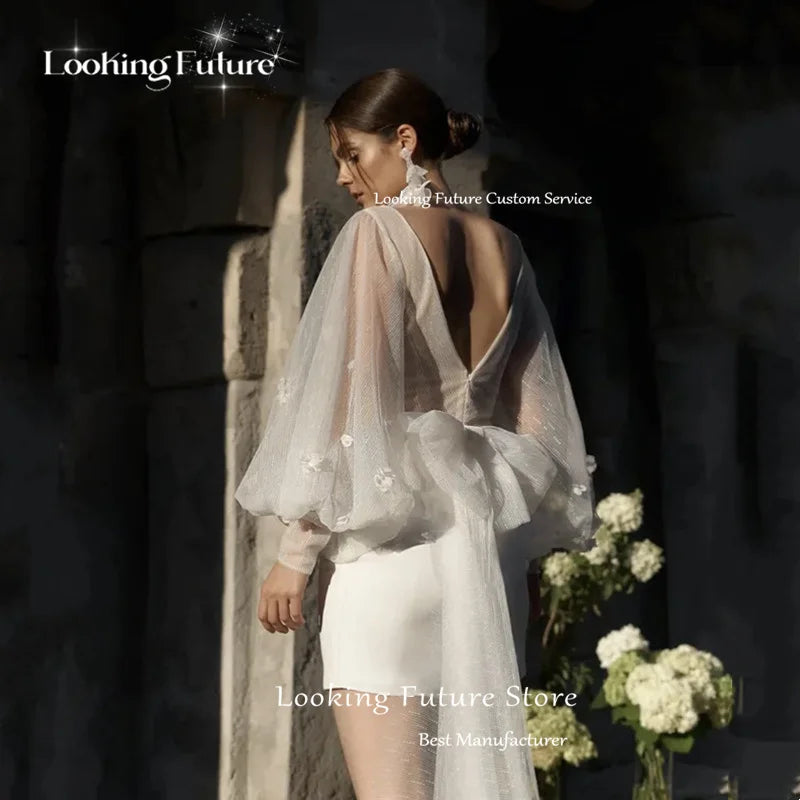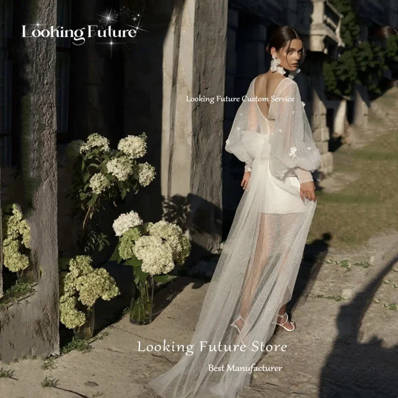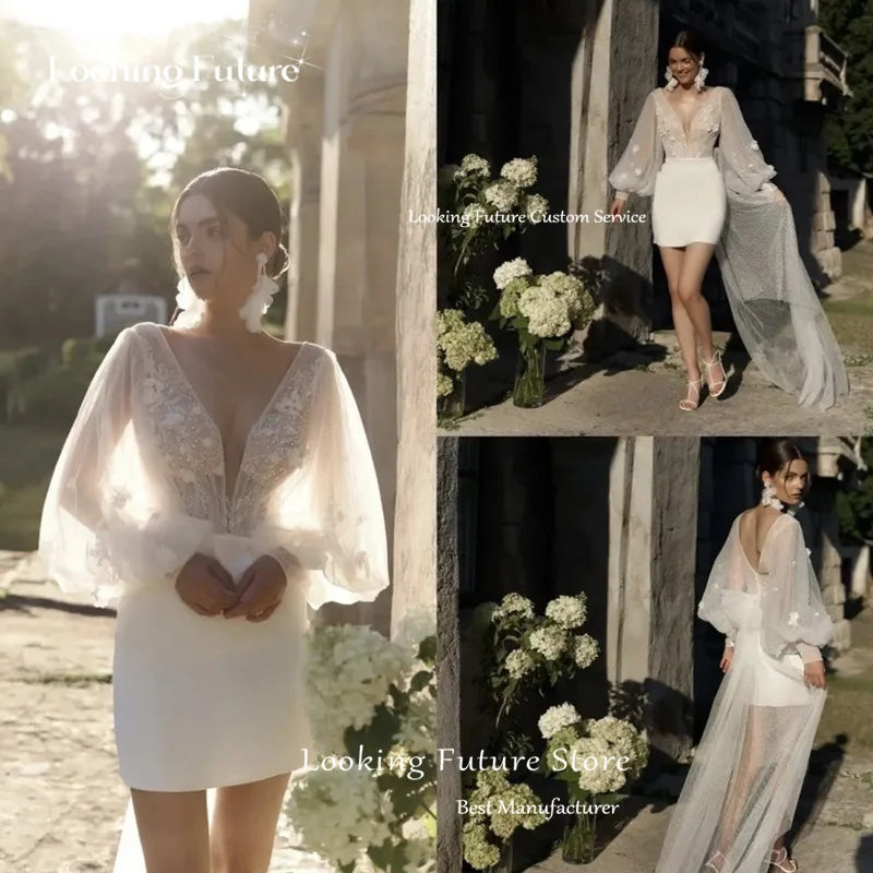 Modern Mini Tulle Wedding Dress 2024 Illusion Long Sleeves Appliques Sexy Deep V-Neck Bridal Dress Wedding Gowns Sweep Traini
