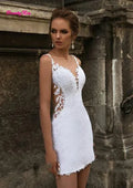 Modern Short Mermaid Wedding Dress with Detachable Train Three Pieces 3 in 1 Lace Applique Sheer Neck Backless Bridal Gowns 2023