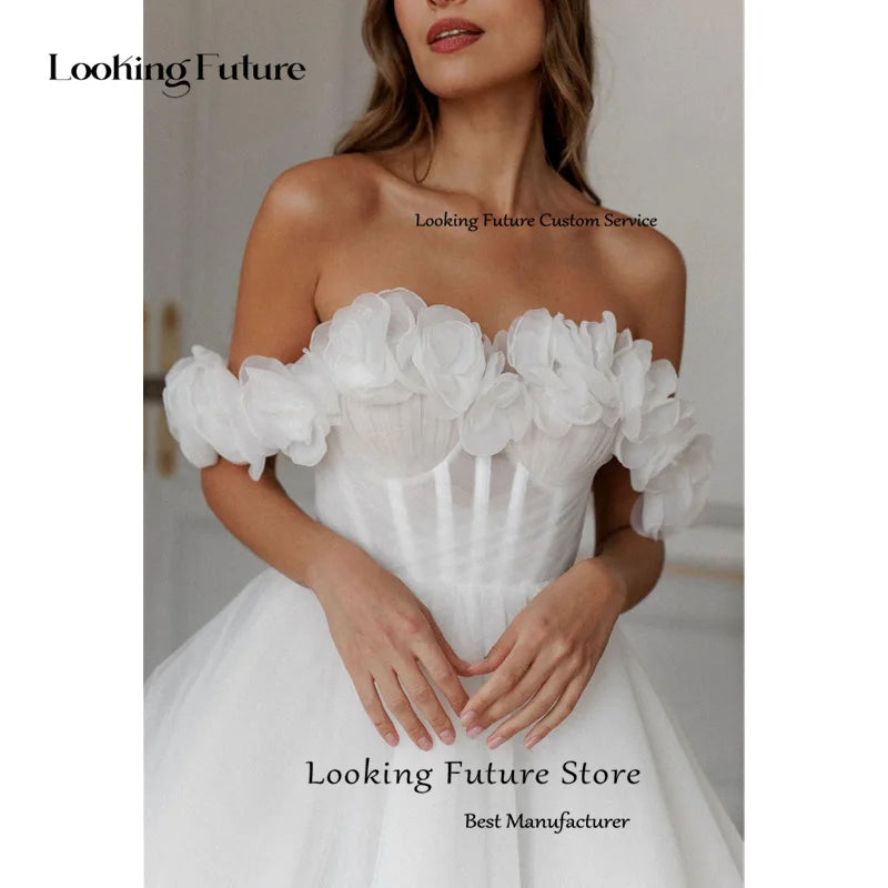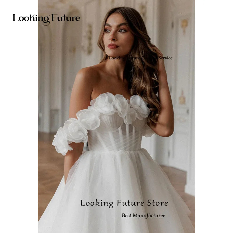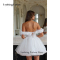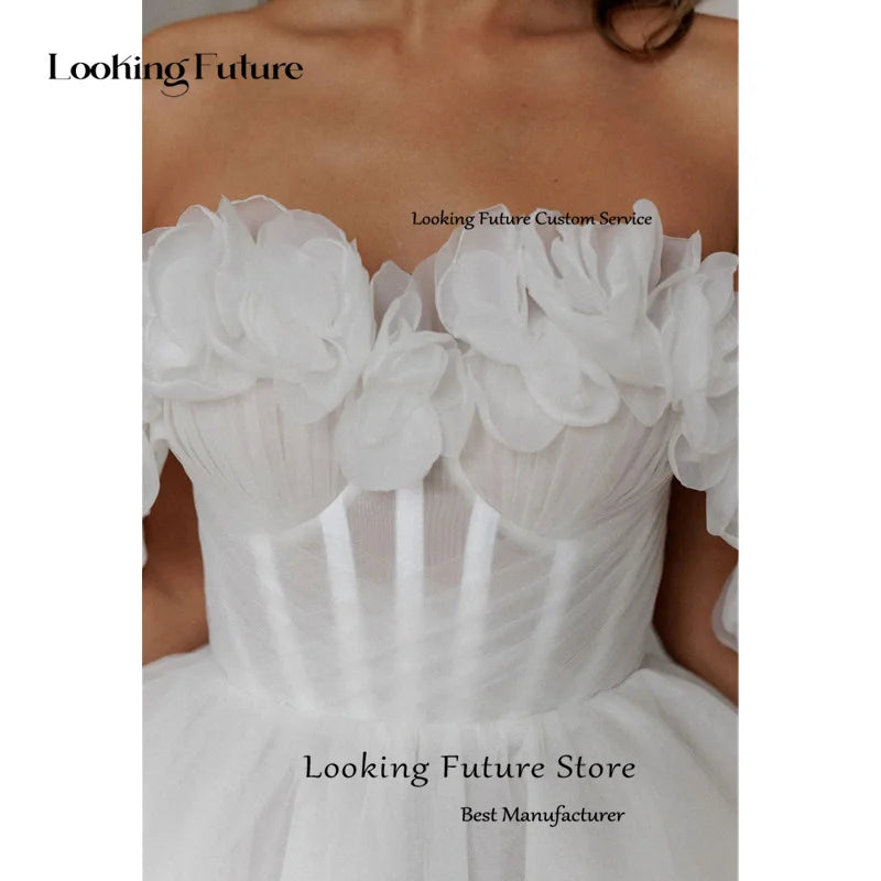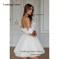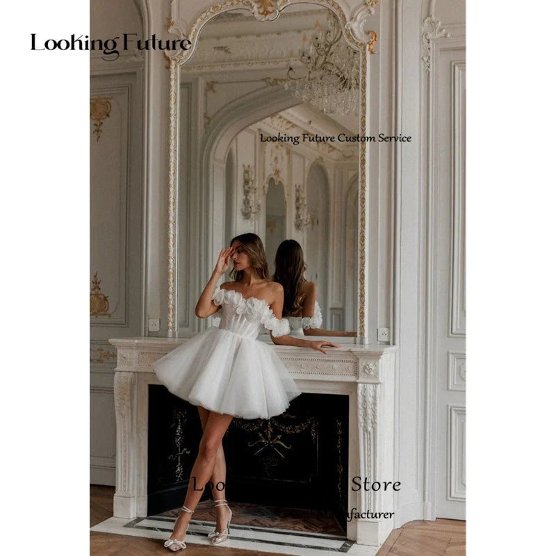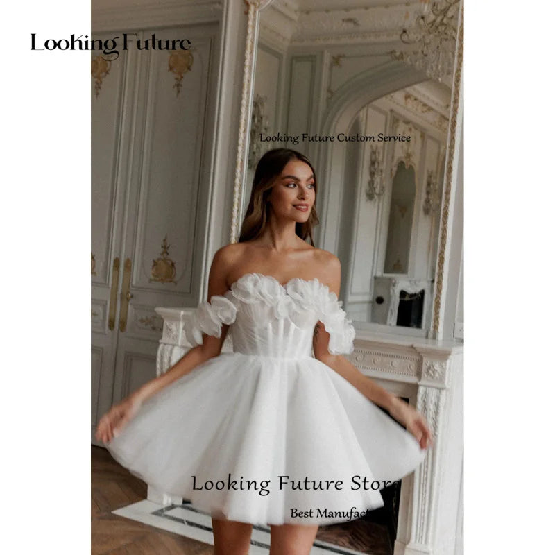 Modern Tulle Mini Ball Gown Wedding Dress Sexy Backless Lace Up Pleat Flowers Sleeveless Elegant Off Shoulder Short Bride Gown