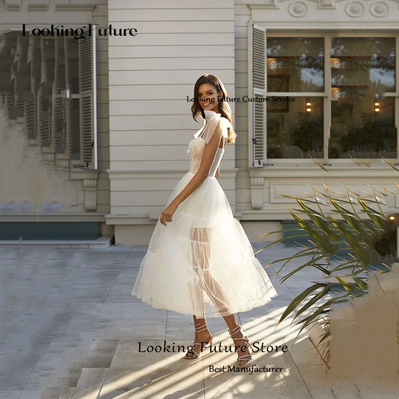 Pastrol A-Line Tulle Wedding Dress Spaghetti Straraps Elegant Sleeveless Pleat Lace Appliques Bow Illusion Backless Bridal Gowns