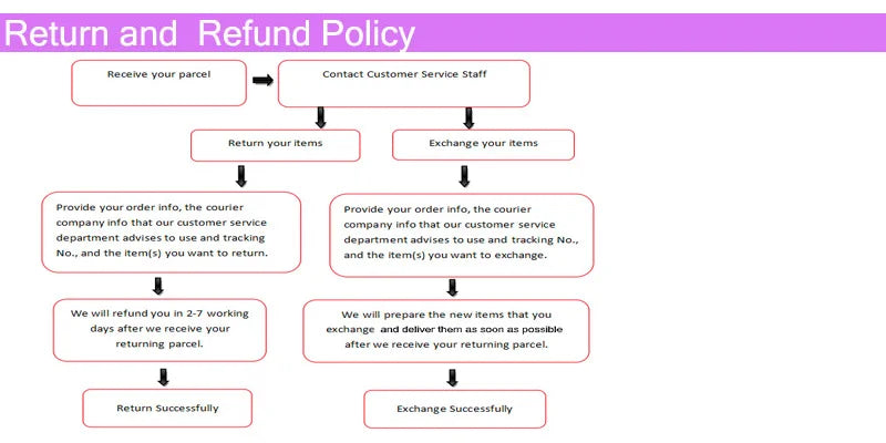 - All returned products will be fully refunded as long as they have not been used or damaged.