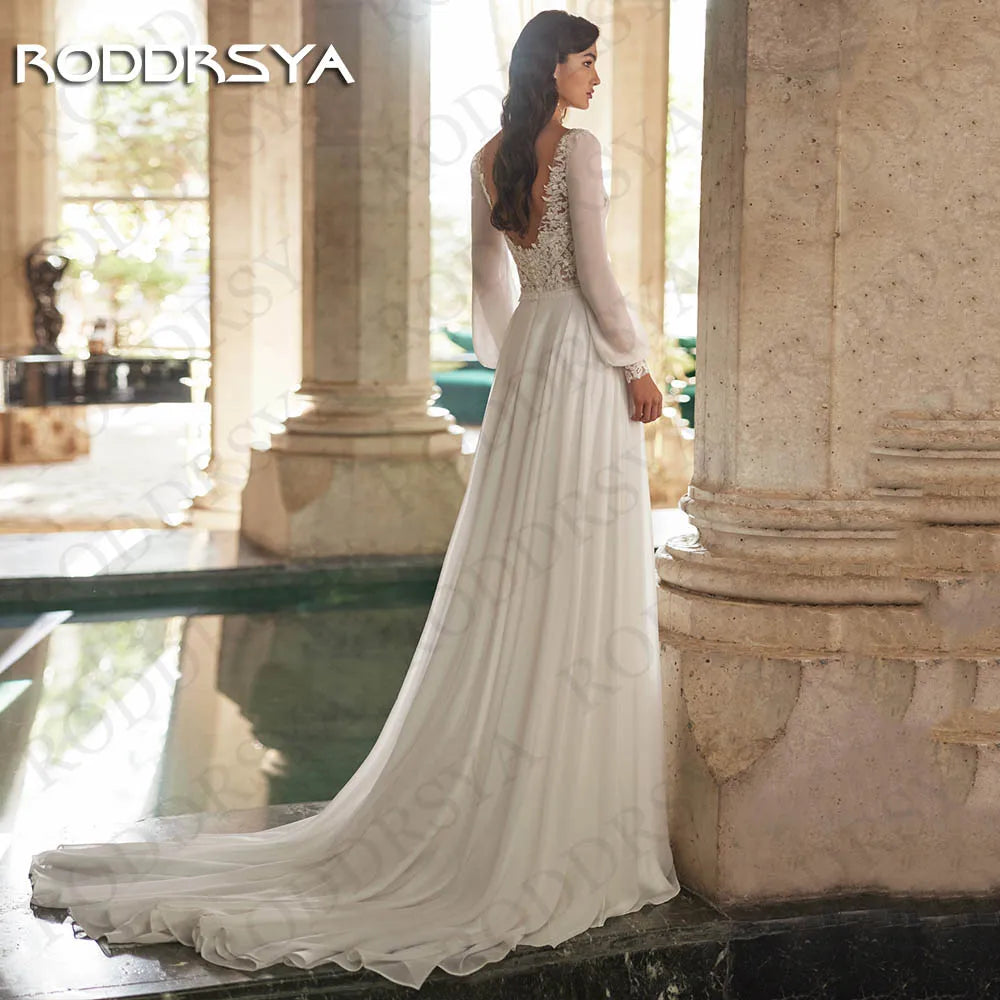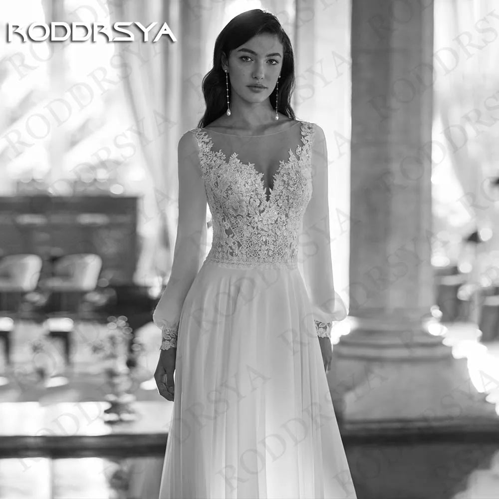 RODDRSYA Long Sleeves Boho Wedding Dresses Lace Appliqeus Charming Beach A Line Chiffon O Neck Backless Bridal Gowns Women 웨딩드레스