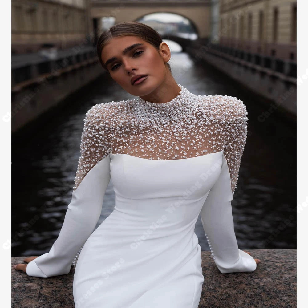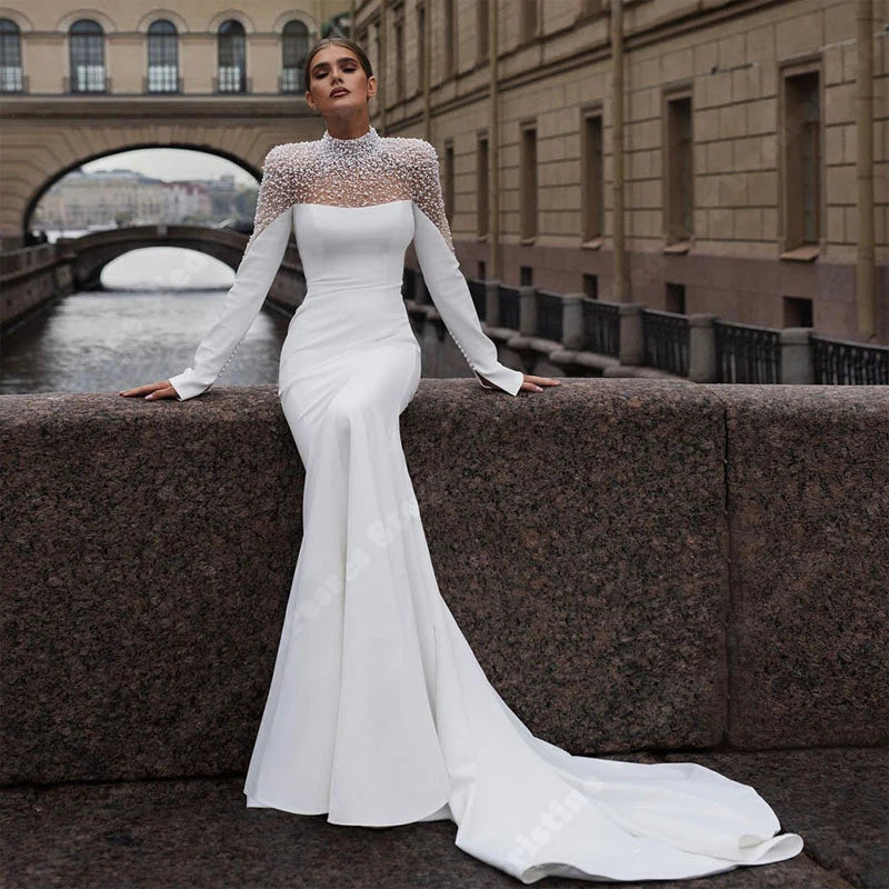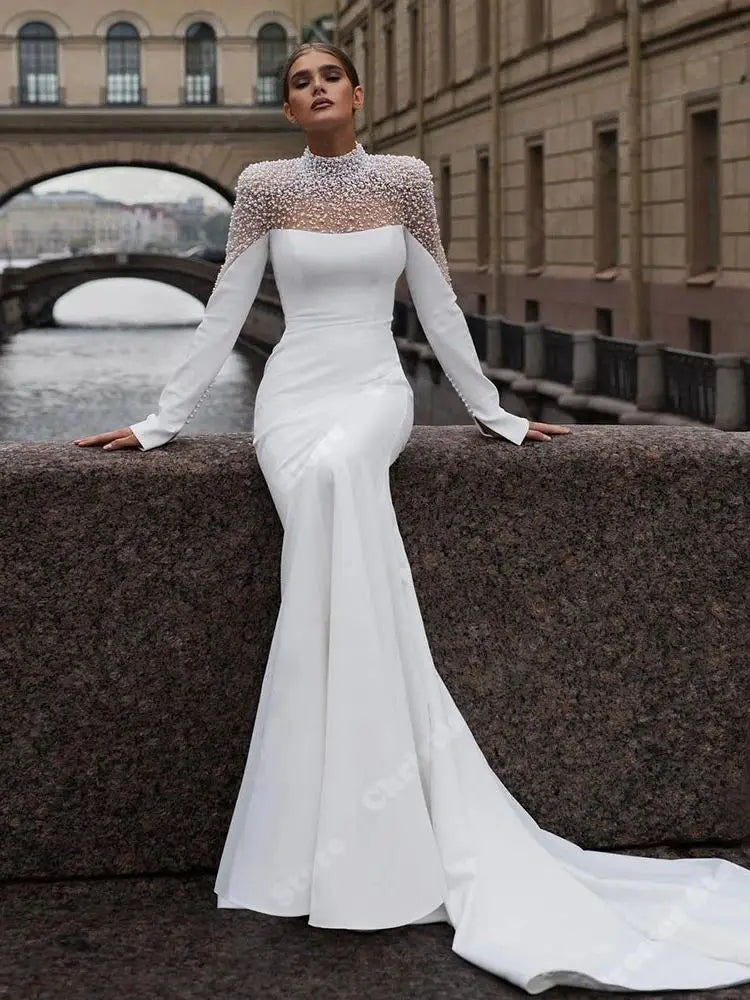 Sexy High-Neck Women Wedding Dresses Newest Exquisite Pearl Bridal Gowns Newest Sexy Mopping Length Princess Vestidos De Novias