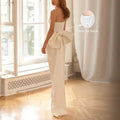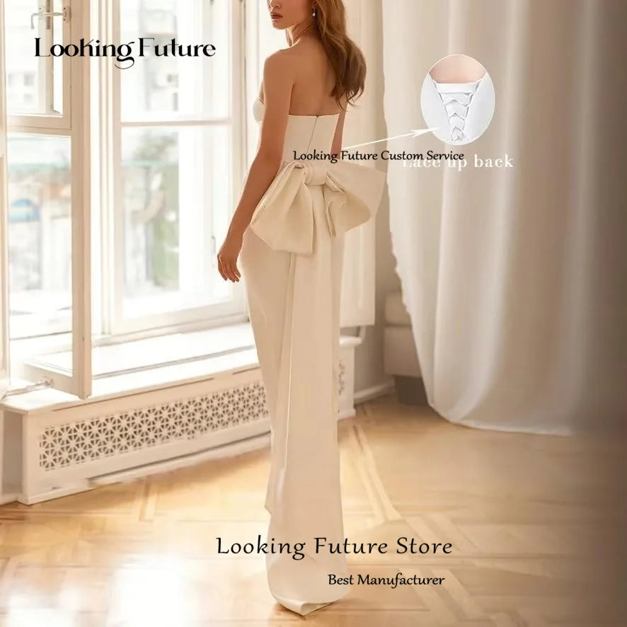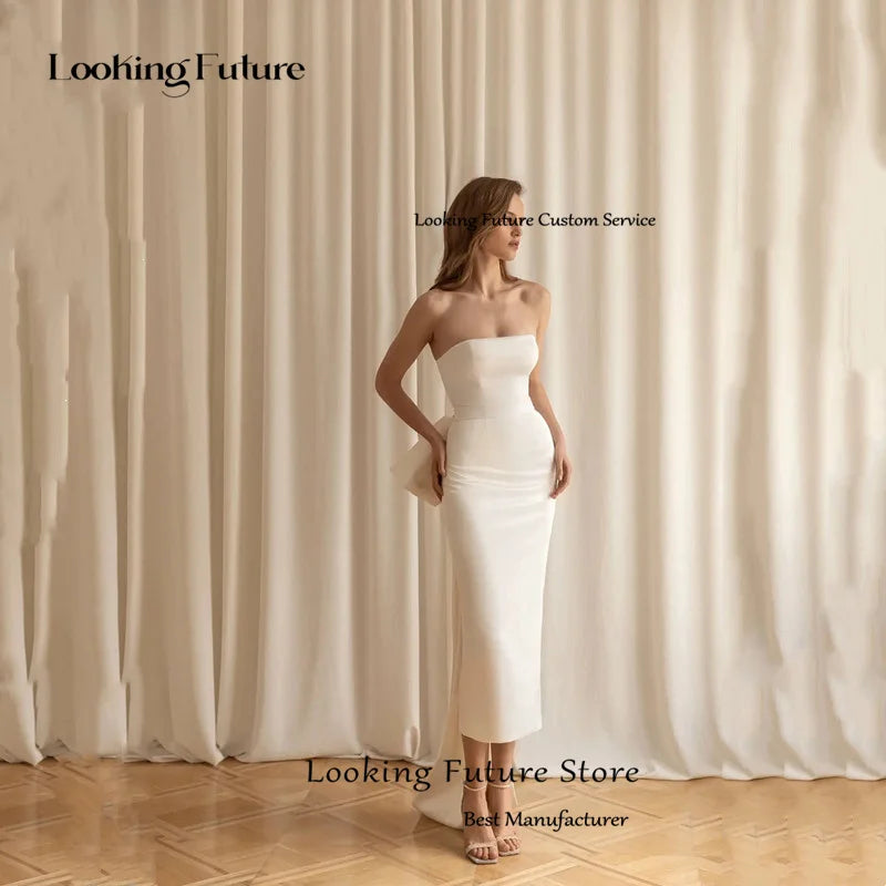 Simple Sexy White Wedding Dress Mermaid Backless With Bow Pleat Satin Bridal Gown Strapless Sleeveless Mid-Calf Court Train 2024