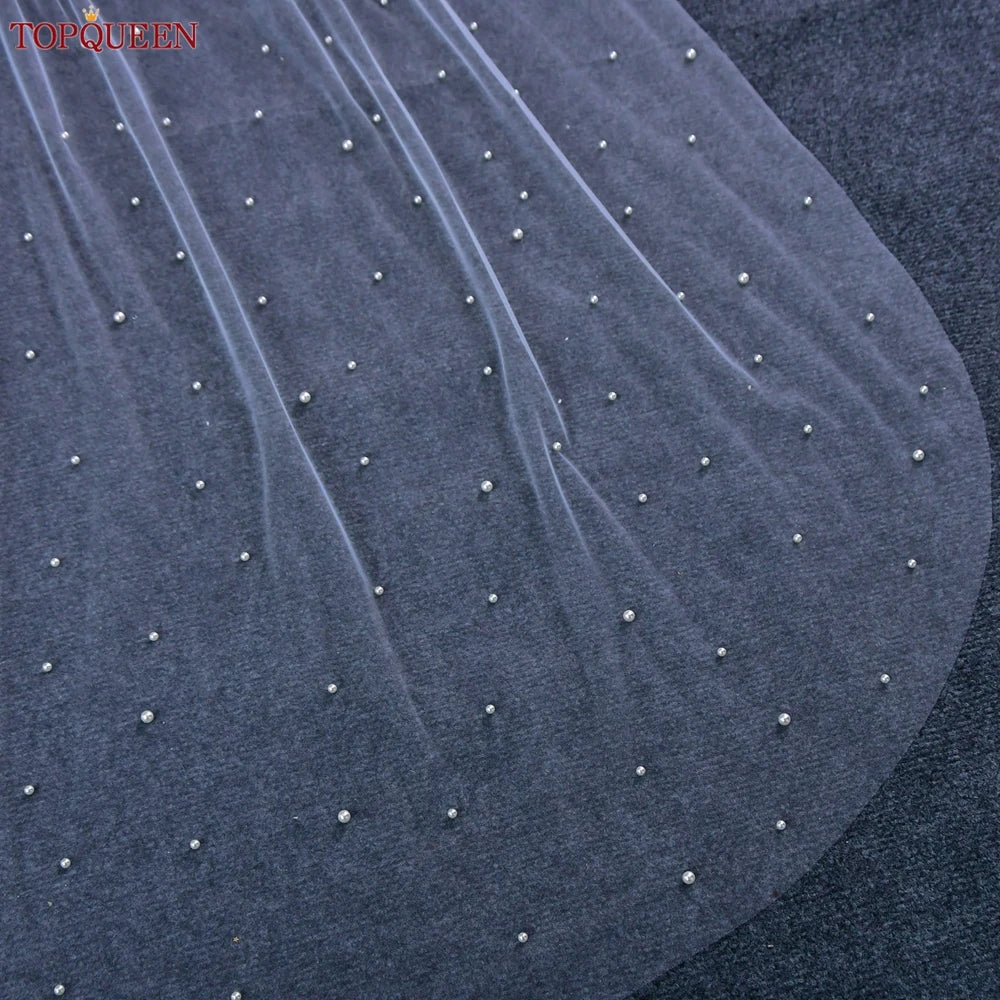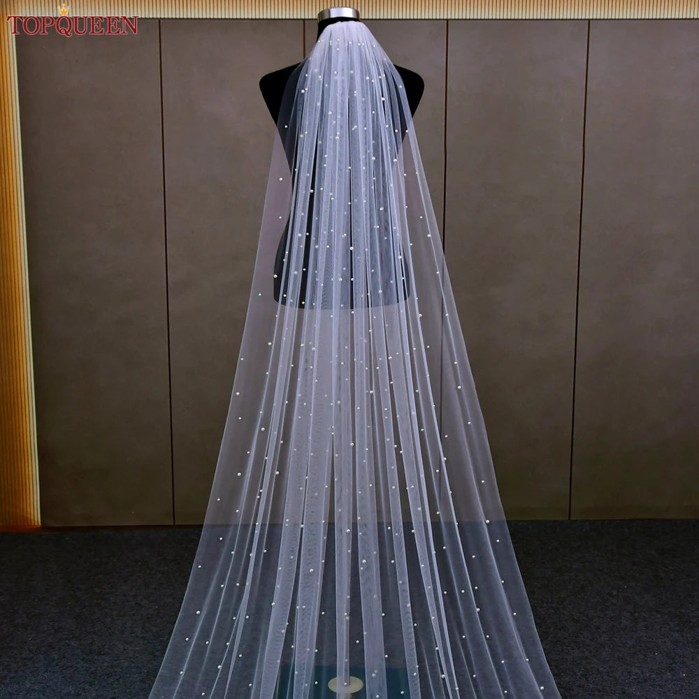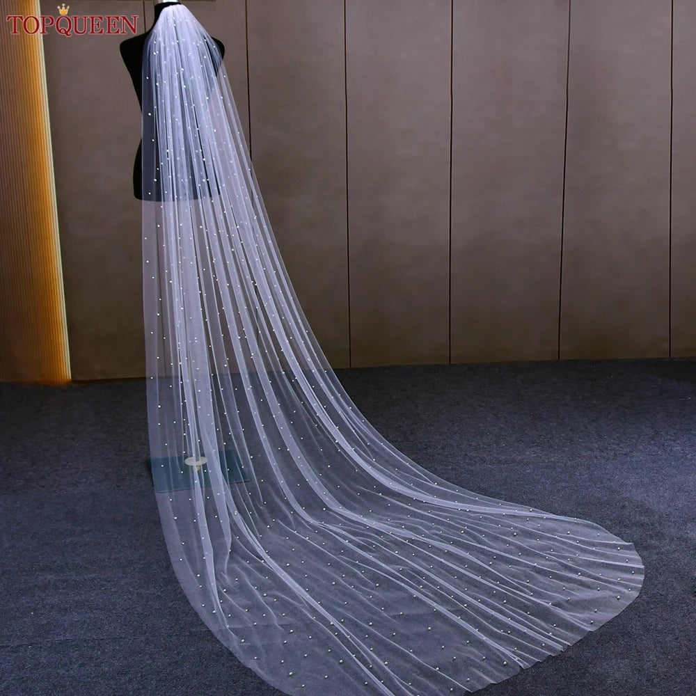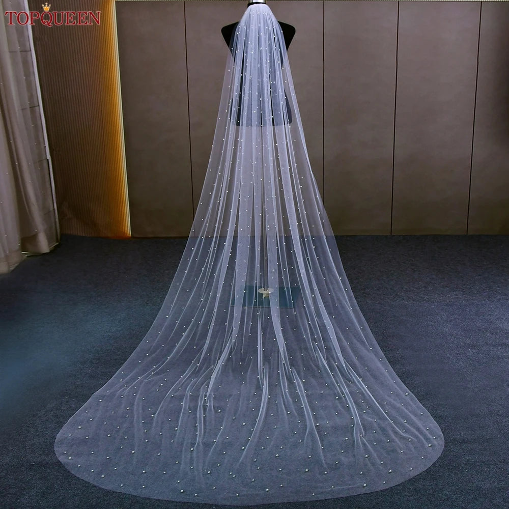TOPQUEEN Pearls Wedding Veils 1 Tier Soft Bridal Veil Beaded Wedding Accessories 3M Cathedral Length Veil for Bride Ivory v176
