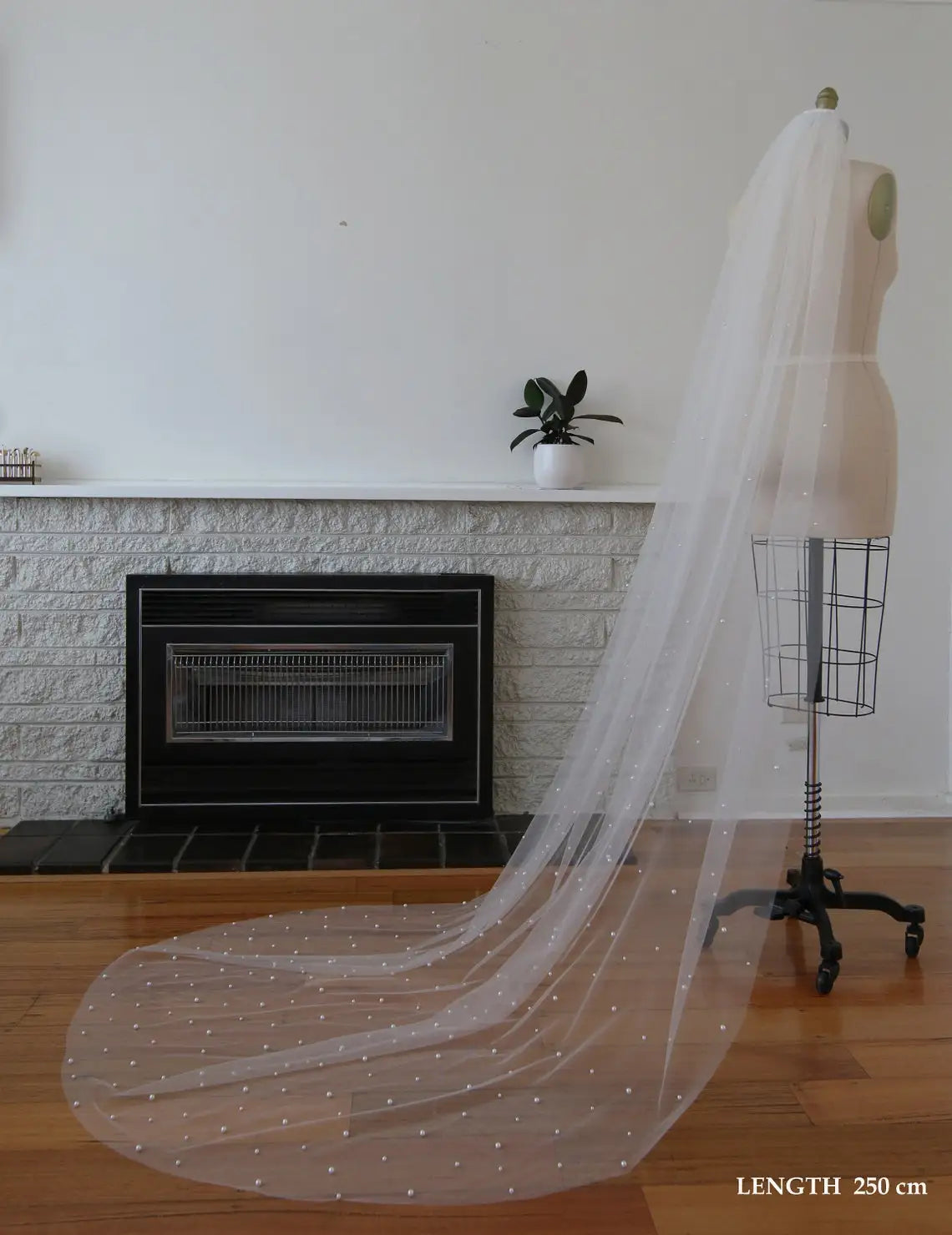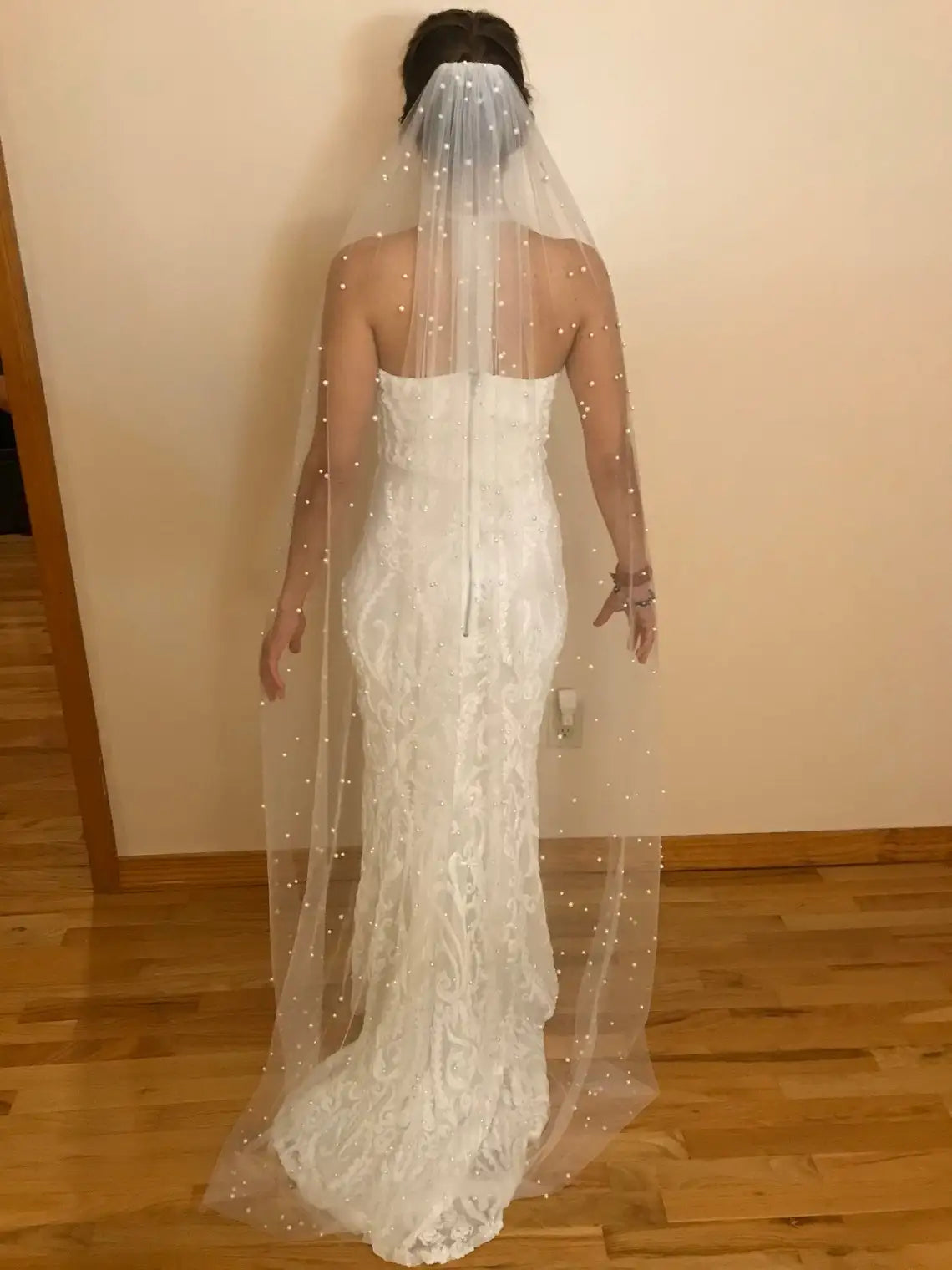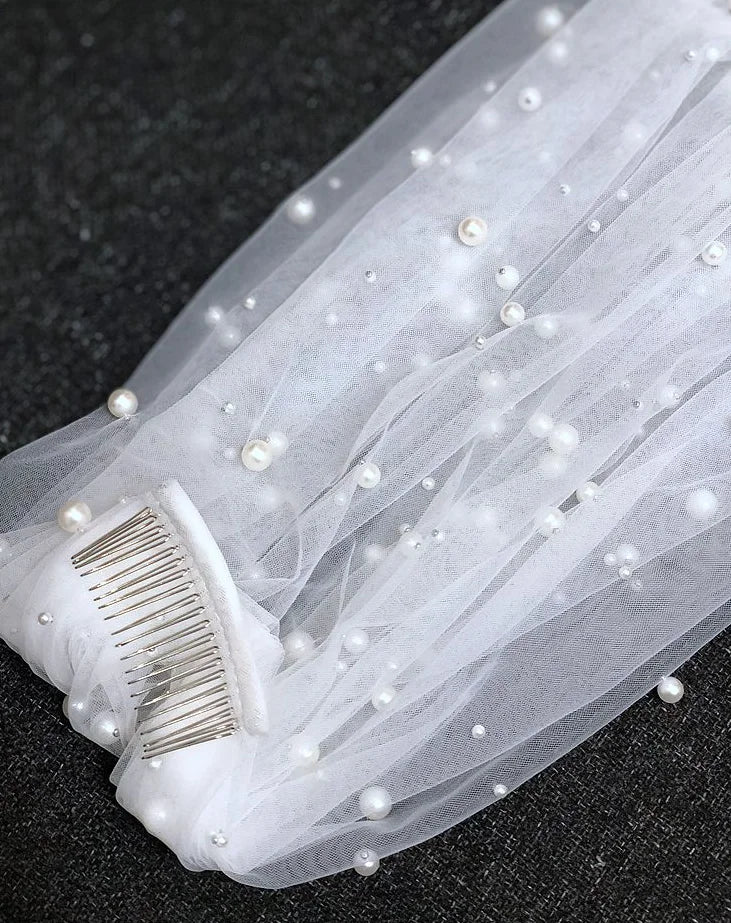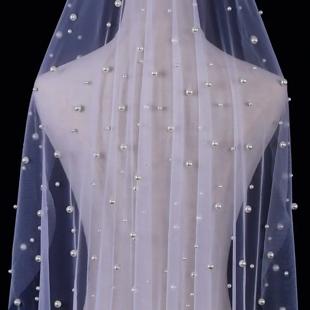 TOPQUEEN Pearls Wedding Veils 1 Tier Soft Bridal Veil Beaded Wedding Accessories 3M Cathedral Length Veil for Bride Ivory v176