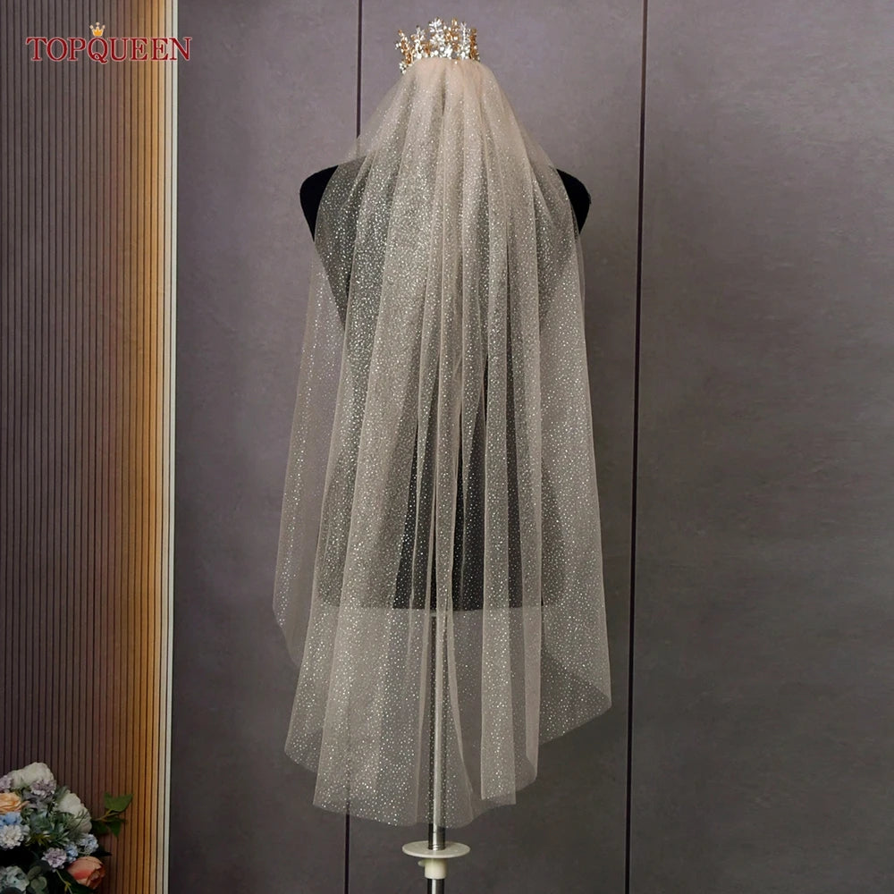 Topqueen V101 Sparking Bridal Veils Long Luxury Golden Bride Wedding Veil Cathedral Champagne Colored Yarn with Sequins Royal