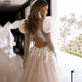 Chic Champagne Princess Lace and Tulle Modern Wedding Dresses Sweetheart Long Puffy Sleeves Glitter Bride Gowns Plus Size