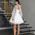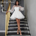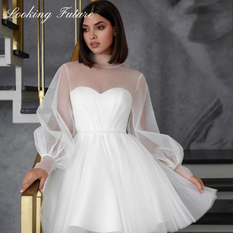 White Short Wedding Dresses for Women 2024 Bride A Line Wedding Gown Long Puff Sleeve Illusion High Collar Sweetie Bridal Dress